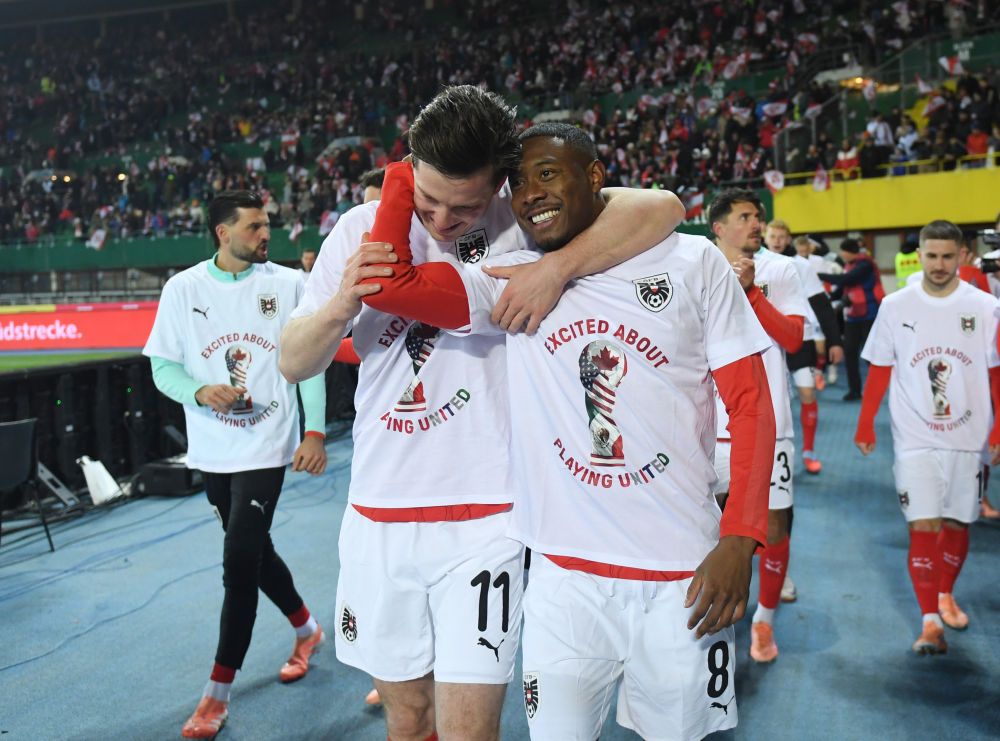 11月18日,在奥地利维也纳进行的2026年美加墨世界杯欧洲区预选赛第一阶段小组赛第10轮比赛中,奥地利队1比1战平波黑队,以H组第一的成绩直接晋级世界杯。奥地利队球员阿拉巴(前右)和格雷戈里奇在比赛后庆祝胜利。新华社