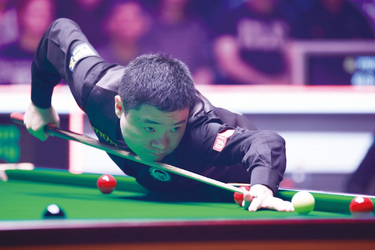 12月1日,丁俊晖在比赛中击球。世界斯诺克巡回赛微博