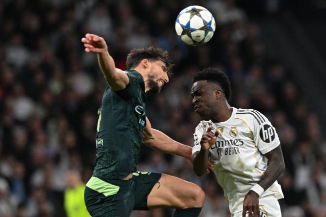 12月10日,皇家马德里队球员维尼修斯(右)在比赛中争顶。新华社