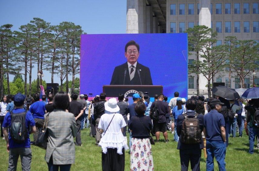 2025年6月4日,民众在韩国首尔汝矣岛国会广场通过大屏幕观看总统李在明就职仪式。当地时间当天上午,李在明在国会正式宣誓就职。中新社资料图