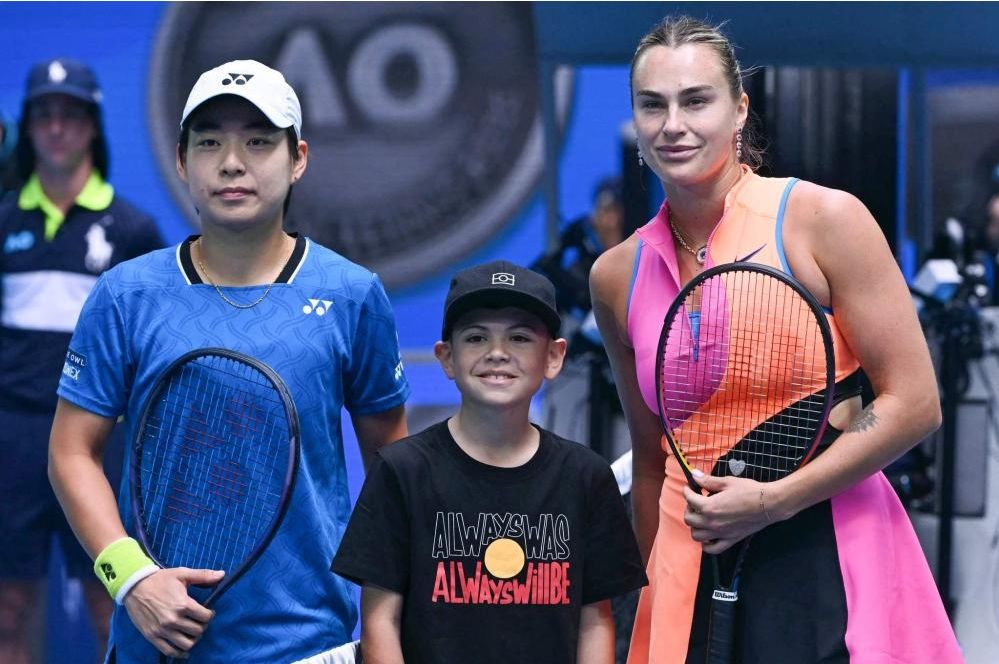 1月21日,白卓璇(左一)和萨巴伦卡(右一)赛前合影。大陆央视网