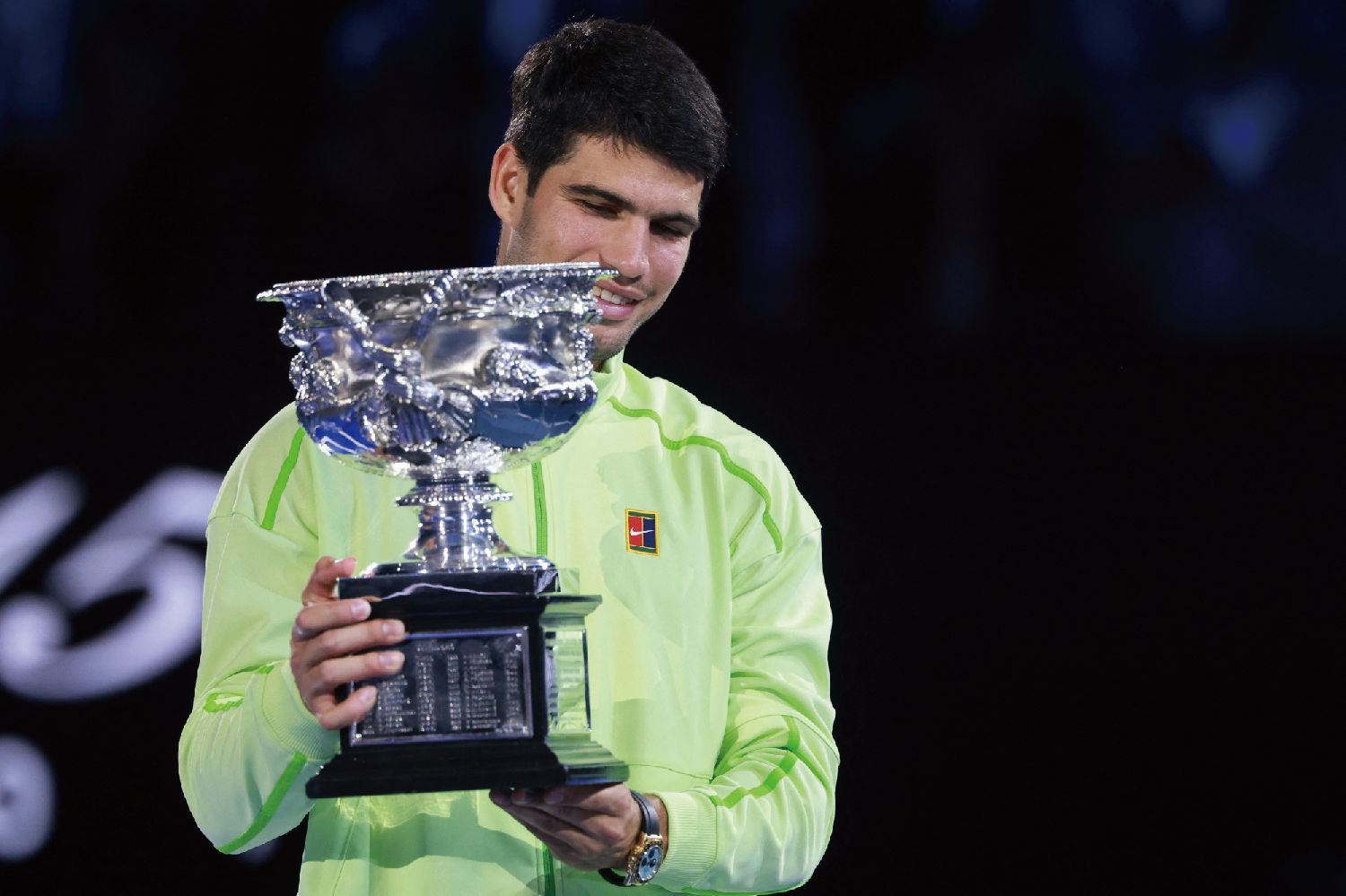 2月1日,阿尔卡拉斯展示澳网冠军奖杯。澳网微博