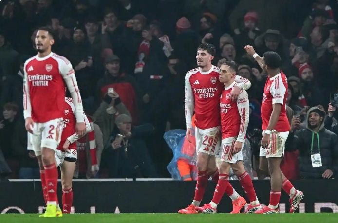 2月3日,阿森纳队球员哈弗茨(右三)进球后与队友庆祝。新华社