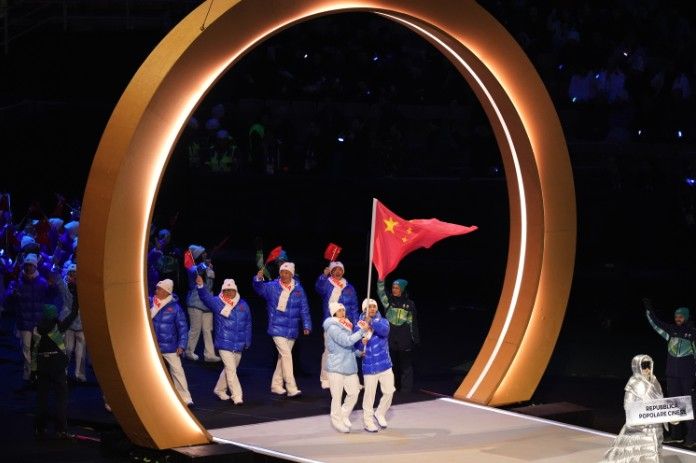 中国体育代表团在双旗手速度滑冰男子运动员宁忠岩和短道速滑女子运动员张楚桐的引领下入场。