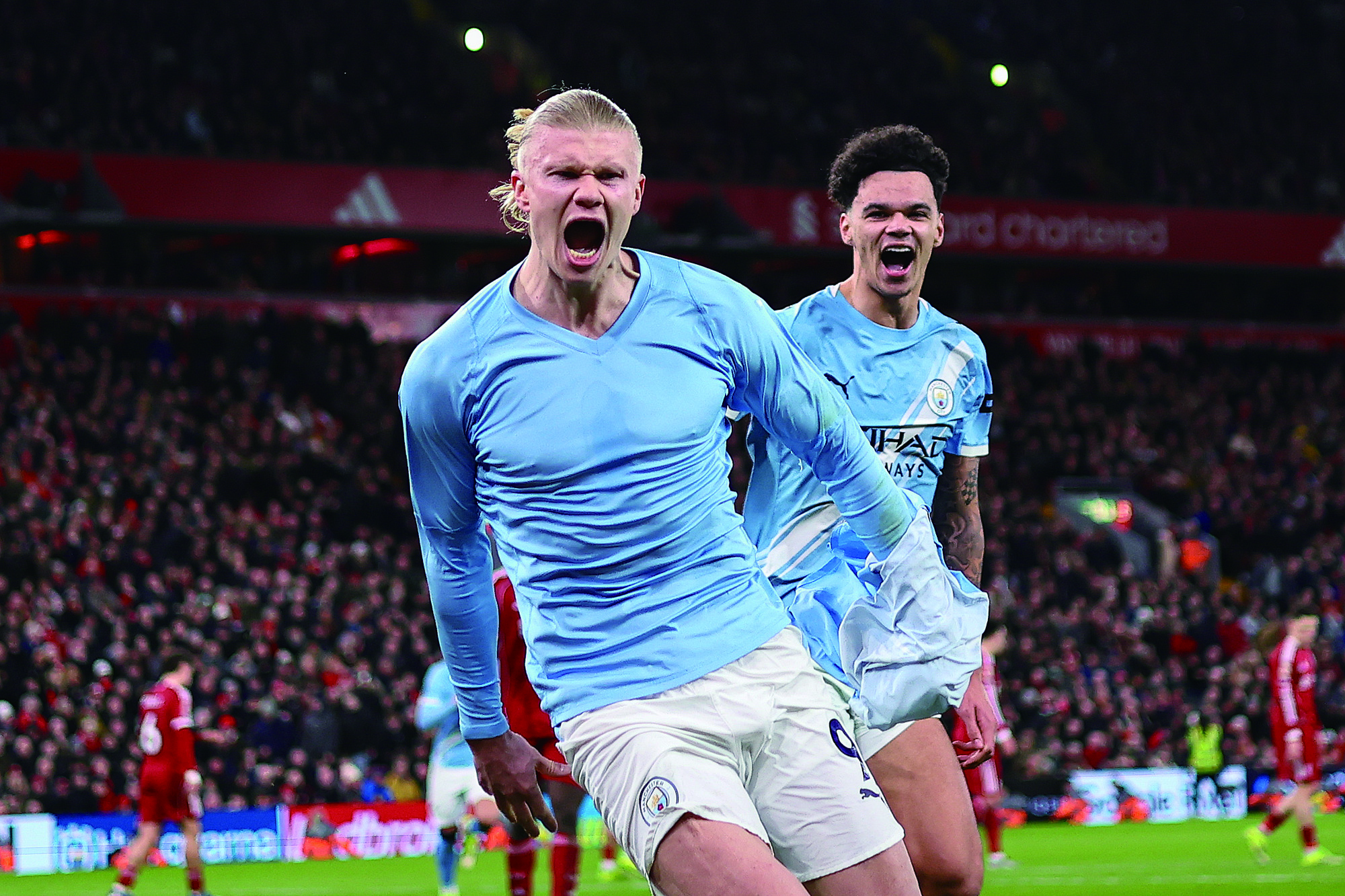 2月8日,曼城球员哈兰德(前)庆祝进球。 视觉中国