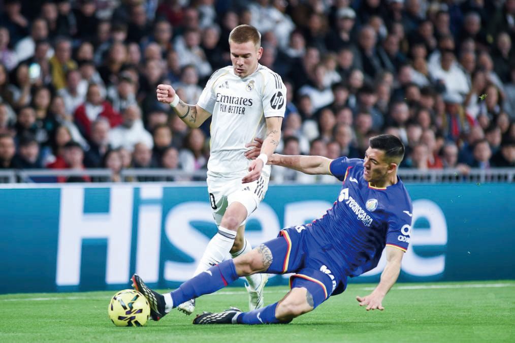 3月2日,皇马球员马斯坦托诺(左)和赫塔菲球员扎伊德·罗梅罗在比赛中拼抢。 新华社