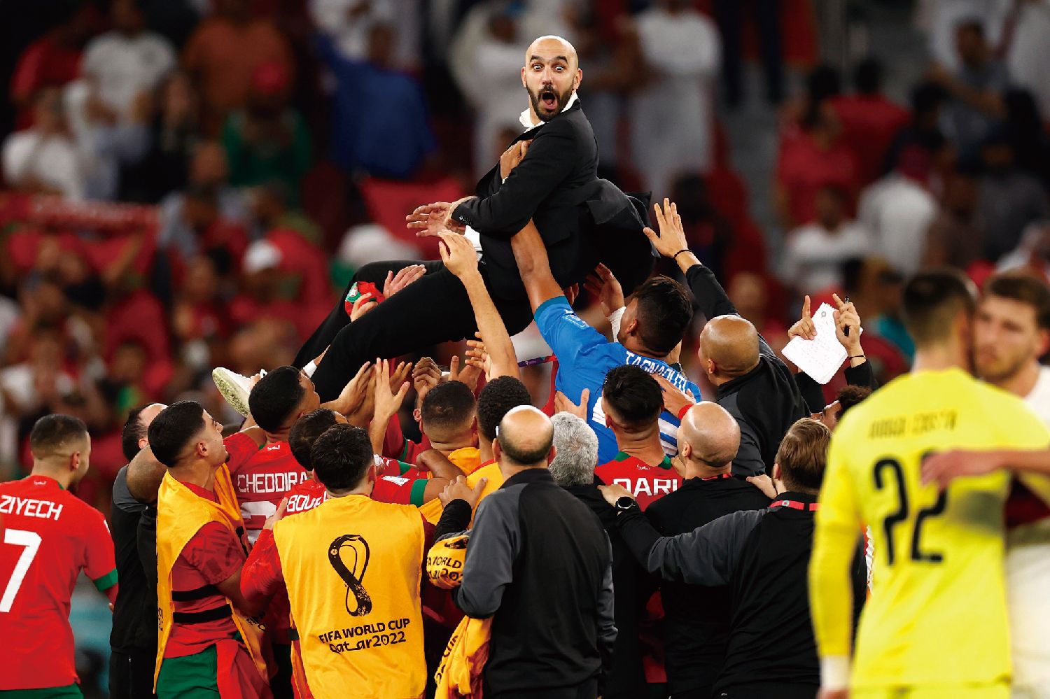 2022年12月10日,摩洛哥队晋级卡塔尔世界杯四强,球员赛后将主帅雷格拉吉高高抛起庆祝。 中新社资料图