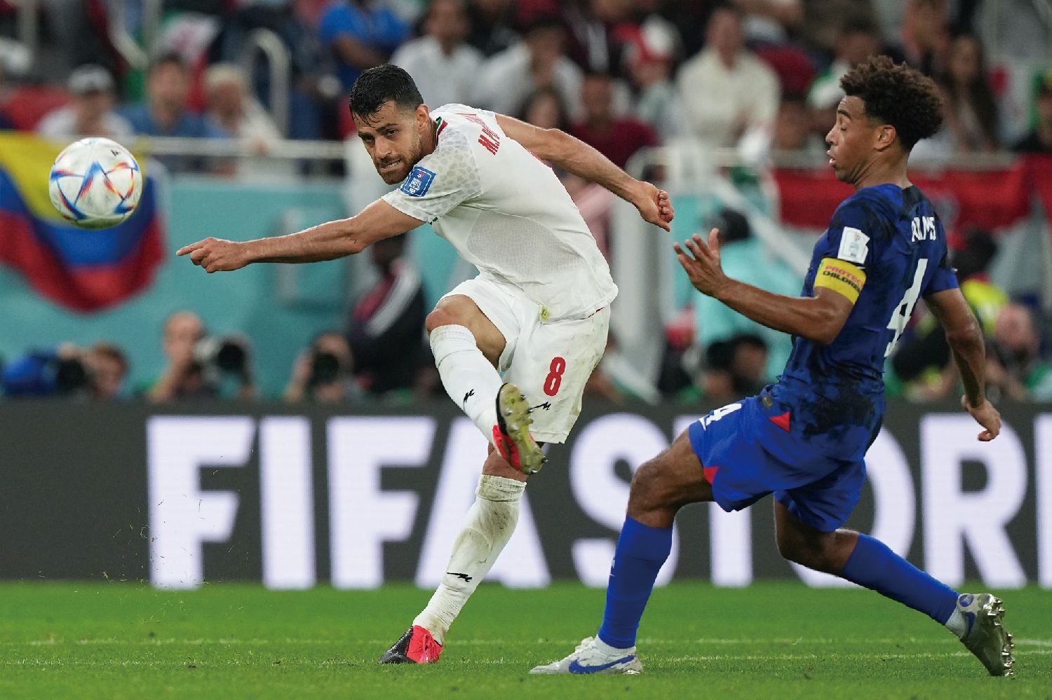 2022年11月29日的卡塔尔世界杯小组赛,美国队1比0击败伊朗队。图为伊朗队球员普拉利甘吉(左)与美国队队长泰勒·亚当斯在比赛中。 中新社资料图