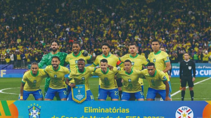 2025年6月10日,在巴西圣保罗举行的2026年美加墨世界杯南美区预选赛中,巴西队主场1比0战胜巴拉圭队。图为巴西队首发球员在赛前合影。 新华社