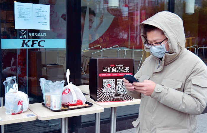 2020年2月7日,消费者在江苏南通如皋市一家外卖店外用手机点餐。 吴树建/人民图片