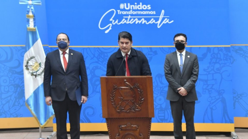 危地马拉外长(左一)与经济部长(中间)共同召开新闻发布会。危地马拉通讯社