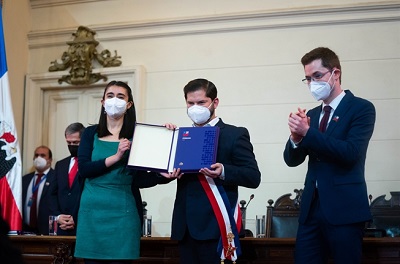 智利总统博里奇(Gabriel Boric,中)从制宪大会主席金特罗斯(María Elisa Quinteros,左)的手中接过新宪法草案。智利总统府官网