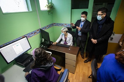 【南美侨报网编译李糖糖报道】智利卫生部副部长阿劳斯(Fernando Araos)、泛美卫生组织(PAHO)代表佩尼亚特(Mario Cruz Peñate)等人近日来到洛斯安第斯市(LosÁngeles)的一处家庭保健中心(Cesfam),见证了“远程医疗”(TeleSalud)初级保健数字化预约平台的启动。
