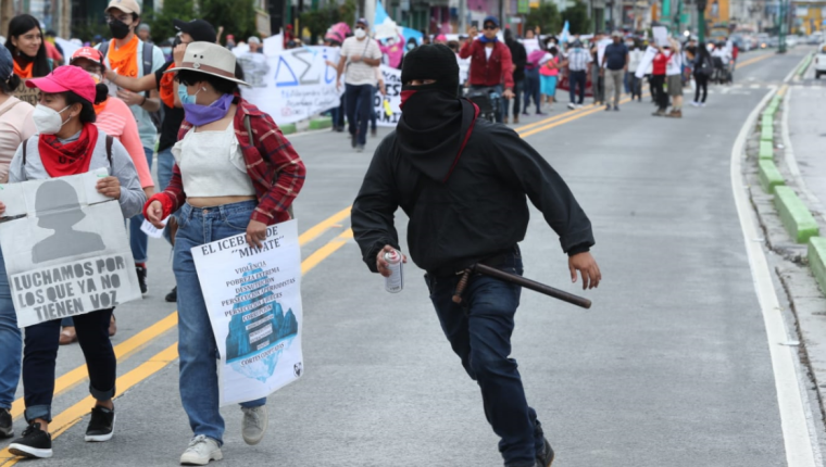 尽管是和平游行,但中途,一群蒙面人在多处制造了骚乱。他们用红色油漆在游行沿途的几个Transmetro车站涂鸦,破坏了宪法广场附近的第六长廊(Portal de la Sexta),还摘下了危地马拉银行(Banguat)和最高法院之间的危地马拉国旗,拖着这面国旗走过了多个街区,最后将国旗烧毁。