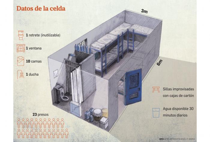 在这间牢房里,何塞只能睡在地板上。如果能在吊床上睡上一宿,他会感到十分幸运。“很多人没有床位。”他表示。