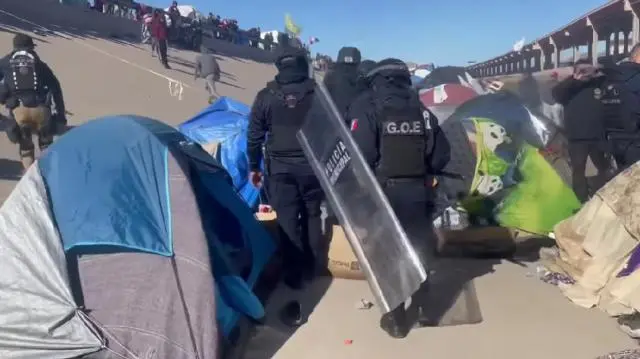 然而,许多人拒绝登上大巴。随后,墨西哥警方开始拆除帐篷,并引发小规模冲突。一些非法移民开始焚烧帐篷以表不满,在此期间,有直升机在天空盘旋。