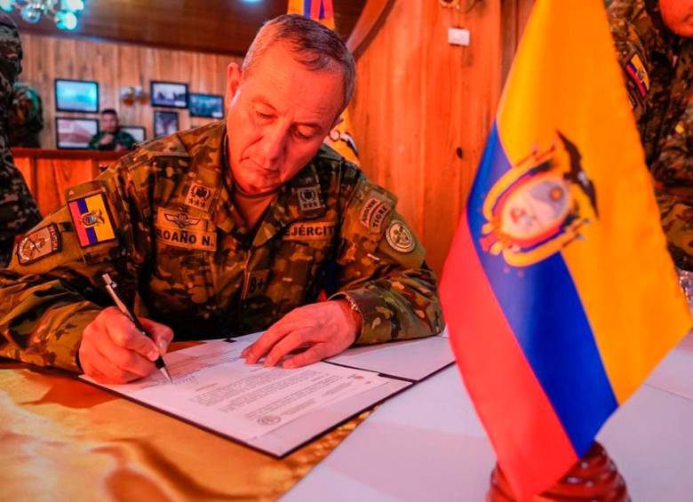 哥伦比亚武装部队总司令吉拉尔多·博尼利亚与厄瓜多尔军方代表签署协议。哥伦比亚《哥伦比亚人报》