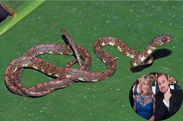 “伊尔梅林迪卡普里奥噬蜗牛蛇”(Sibon irmelindicaprioae),右下角为演员莱昂纳多·迪卡普里奥(Leonardo DiCaprio,右)以及他的母亲(左)。巴拿马《巴拿马美洲报》