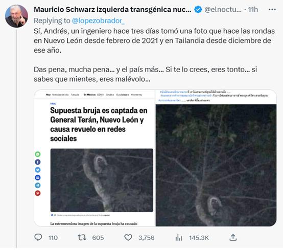 洛佩斯相关推文下方,有网民直接回复、转发称,“是的,安德烈斯(洛佩斯),3天前一位工程师拍了这张照片。但这张照片从2021年2月的新莱昂州开始,到同年12月份的泰国,都有出现过。你好丢人,太丢人了……我们国家最丢人……如果你真信了,那你就是个傻瓜……如果你知道这是假的,那你真是用心险恶……”