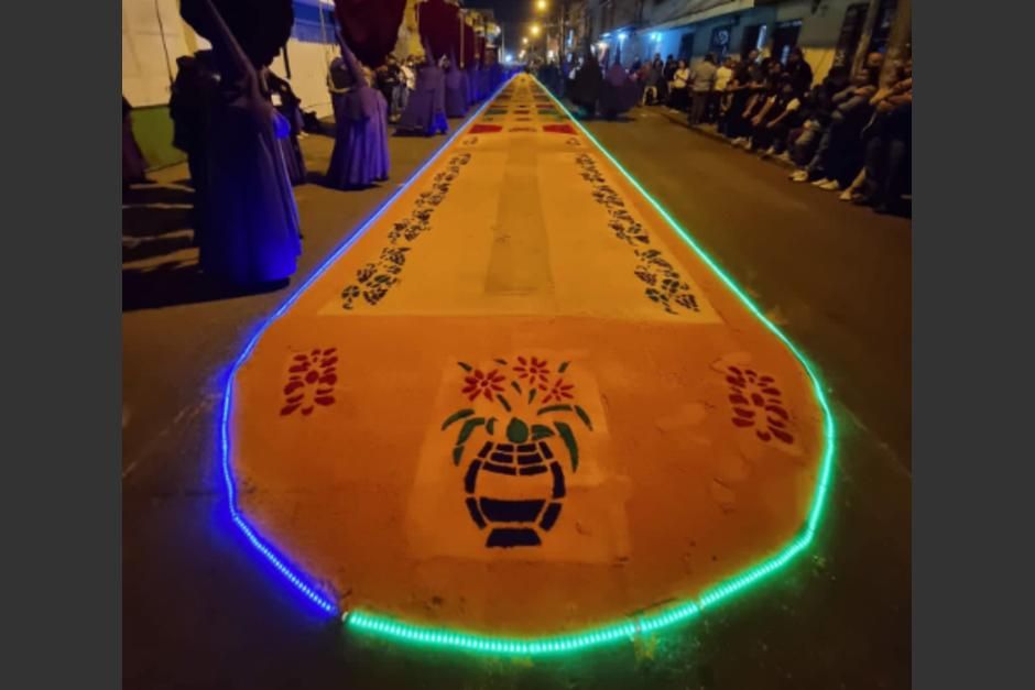 危地马拉《自由新闻报》4月5日报道,危地马拉圣周地毯通常用锯末、松木甚至水果等不同的材料制成,图案丰富多样,铺设在游行队伍途经的路上。近日,一组LED灯地毯的图片在危地马拉社交平台“疯传”。这条地毯带有LED灯,在晚上尤为显眼,独特的创意吸引了许多路人前来围观,并拍照分享。