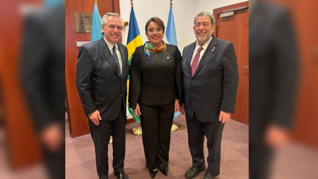 洪都拉斯总统希奥玛拉·卡斯特罗(中)与阿根廷总统阿尔韦托·费尔南德斯(左)和圣文森特和格林纳丁斯总理拉尔夫·冈萨维斯(右)合影。洪都拉斯《论坛报》