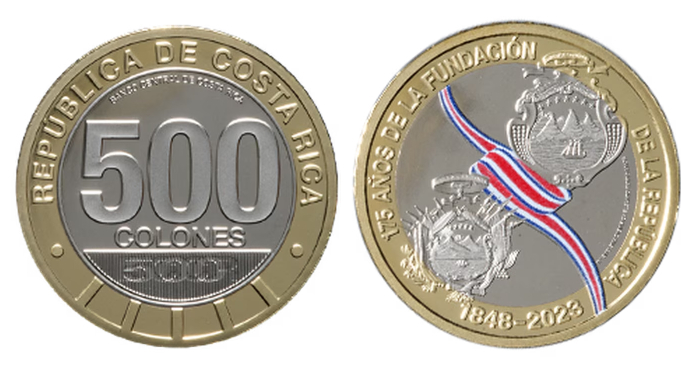 硬币背面刻有1848年的哥斯达黎加国徽和如今的国徽,一条哥斯达黎加国旗颜色的丝带将两枚国徽连接在一起;还有“共和国建立175年”“1848年-2023年”的字样,以及哥斯达黎加国歌《庄严的祖国,您美丽的旗》的歌词的微缩文字。