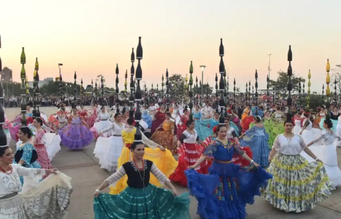 巴拉圭《最新时刻报》报道,在亚松森市海滨地区(Costanera,Asunción)举行的首届“全国瓶舞日”活动期间,在美丽的落日背景下,500名女性舞者头顶2000个瓶子,展示了巴拉圭传统民间舞蹈的魅力。