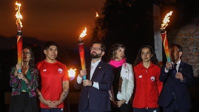 智利总统博里奇(左三)手持2023年圣地亚哥泛美运动会火炬。 智利ADN电台网站