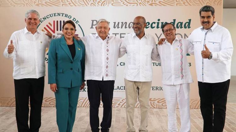 墨西哥总统洛佩斯(左三)在峰会期间与拉美多国首脑合影。洛佩斯个人推特