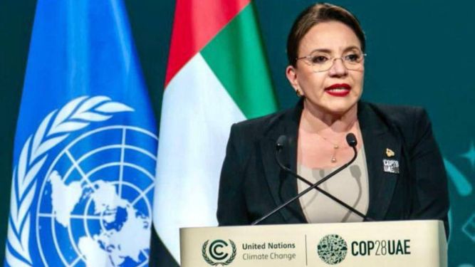 洪都拉斯总统卡斯特罗在COP28发表演讲。洪都拉斯《论坛报》