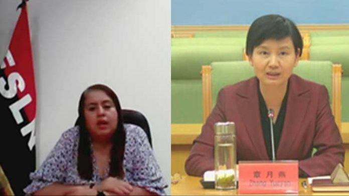 3月29日,尼加拉瓜马萨亚市市长亚尼娜·诺圭拉(左)与中国浙江省台州市副市长章月燕(右)举行视频会议,围绕建立友城关系等话题进行会谈。尼加拉瓜“TN8”电视台网站