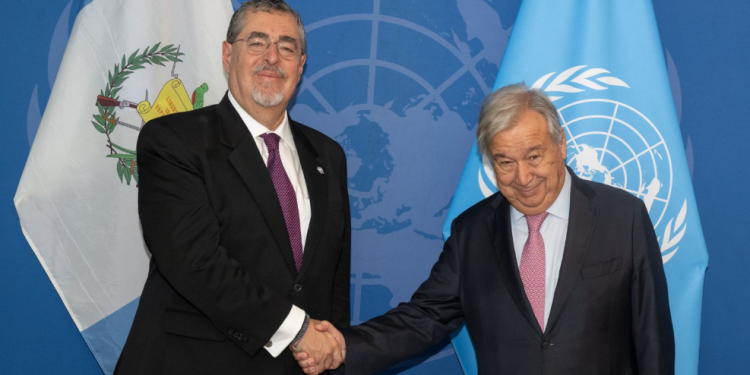 阿雷瓦洛与联合国秘书长安东尼奥·古特雷斯(右)举行会面。危地马拉通讯社