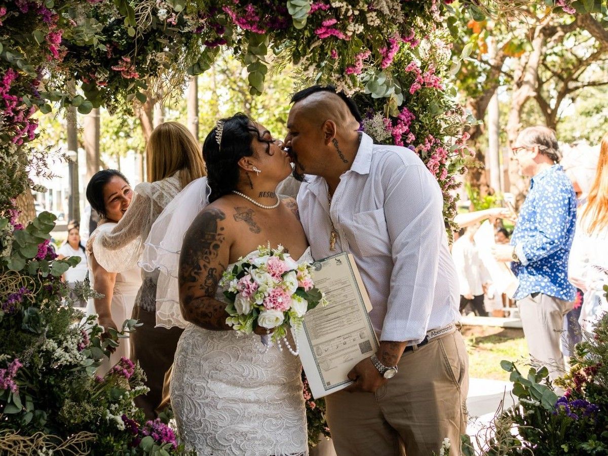 墨西哥一对新人在婚礼上互吻。墨西哥《至上报》