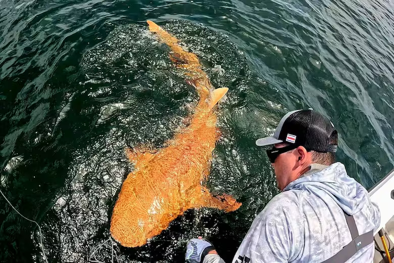 哥斯达黎加《国家报》报道,据悉,这条亮橙色的鲨鱼在哥斯达黎加托尔图格罗国家公园(Parque Nacional Tortuguero)附近37米深的水域被发现。这条鲨鱼体长约两米,皮肤为橙色,与其所属物种特有的棕色截然不同,其眼睛则为白色。在拍摄几张照片后,垂钓组织者将它放回了大海。