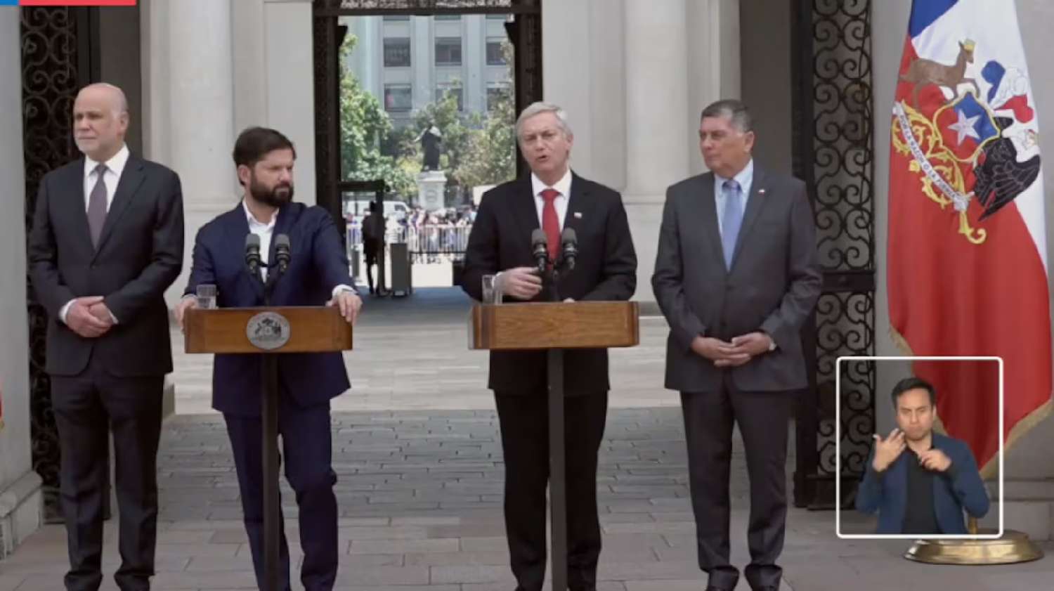 智利总统博里奇(左二)与当选总统何塞·安东尼奥·卡斯特(右二)发表联合声明。智利网站“publimetro”