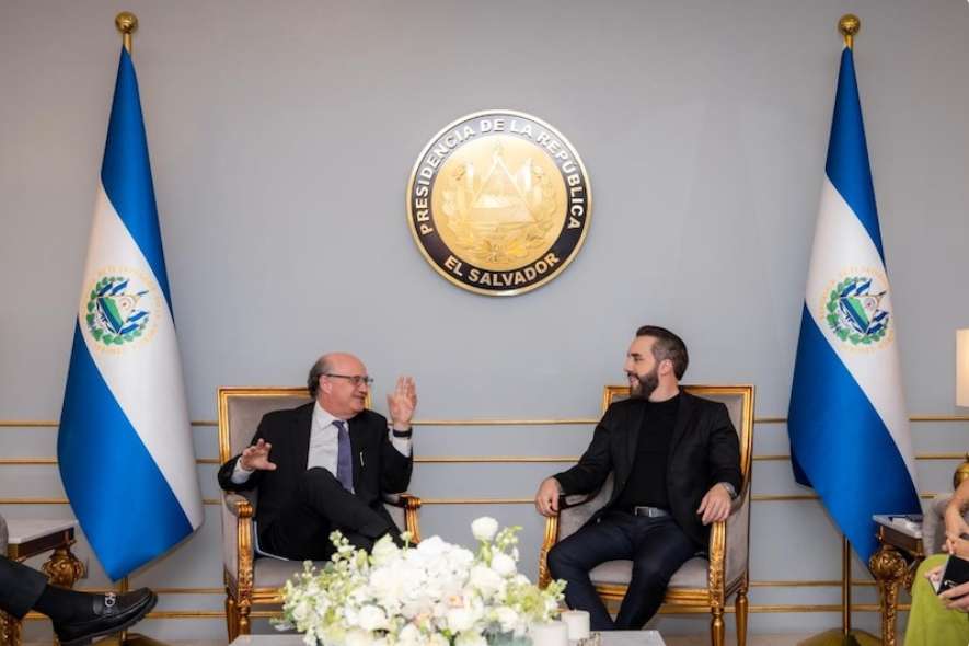 美洲开发银行行长伊兰·戈德法恩(左)在与萨尔瓦多总统布克尔会晤。萨尔瓦多《世界报》