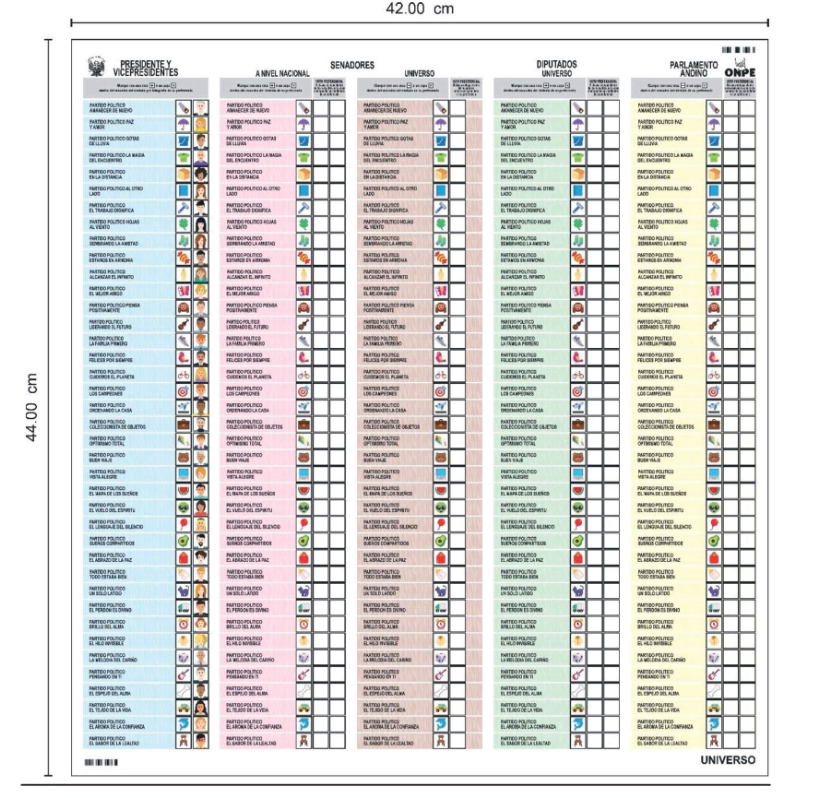 与以往不同,今年秘鲁恢复由参议院和众议院组成的两院制议会制度,因此选民将选举5类不同的公职人员,每类均位于选票上的独立一栏:“总统及副总统”“全国参议员”“地区参议员”“众议员”“安第斯议会”。这些选举互不关联,因此某一栏的错误并不会导致其余栏失效。
