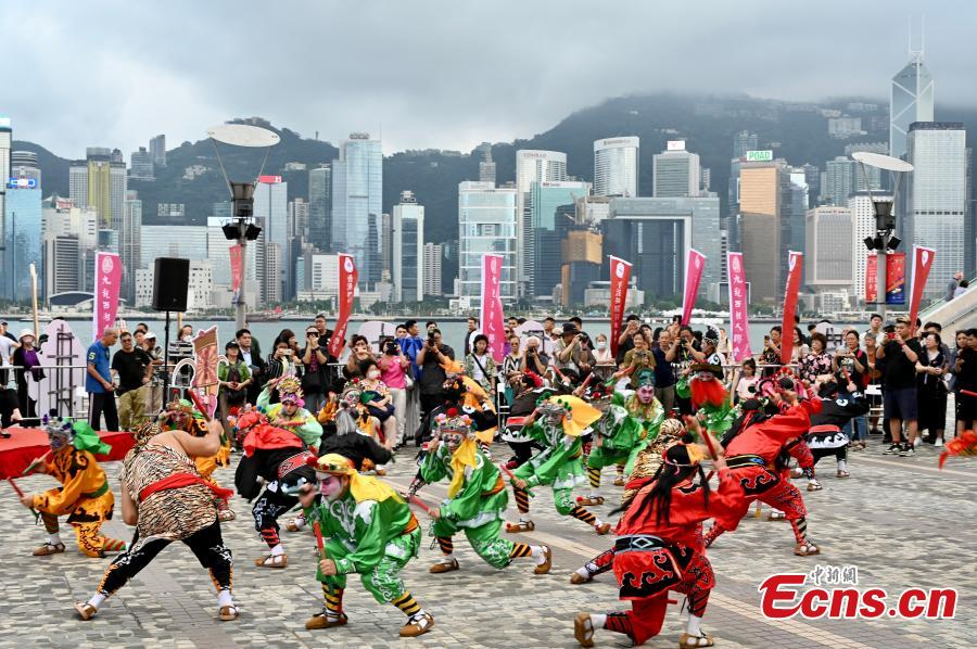 Dançarinos apresentam a dança Yingge de Chaoshan, na Região Administrativa Especial de Hong Kong, em 29 de abril de 2024. (Foto:Chinanews)