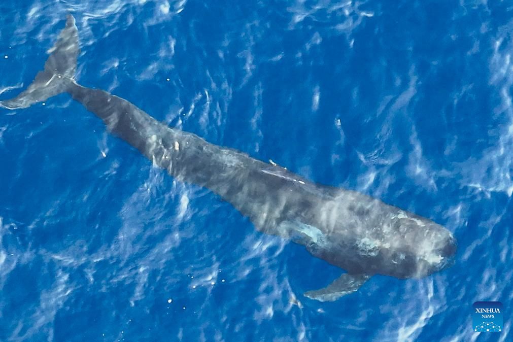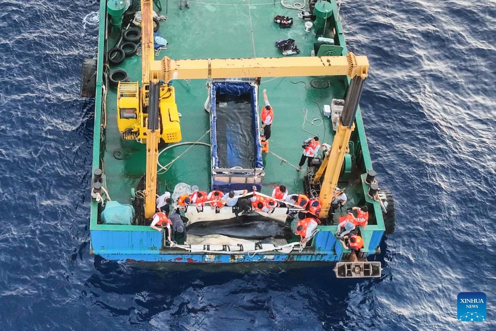 Em 26 de maio, uma baleia-piloto de barbatana curta voltou para o mar a partir de um navio de pesquisa científica na província insular de Hainan, no sul da China. (Xinhua)