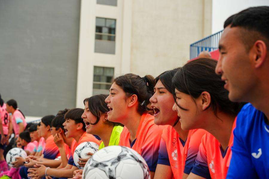 Membros da equipe feminina sub-13 de futebol da cidade de Artux torcem pelo time durante uma partida amistosa na sub-região autônoma quirguiz de Kizilsu, Região Autônoma Uigur de Xinjiang, noroeste da China, 12 de abril de 2025. (Foto: Xinhua)