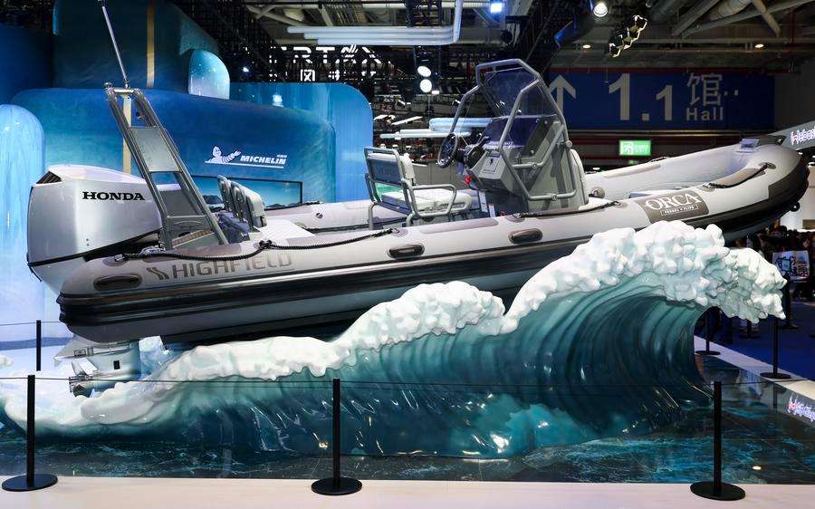 Um barco inflável de casco rígido com revestimento composto é visto no estande da Michelin na área de exposição Automóvel e Mobilidade Inteligente da 8ª Exposição Internacional de Importação da China (CIIE) em Shanghai, leste da China, em 8 de novembro de 2025. (Foto: Xinhua)