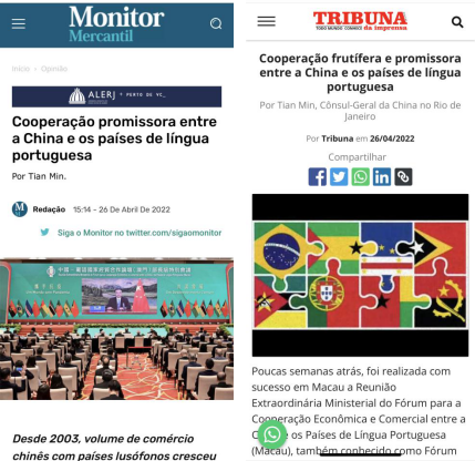 2022年4月26日,驻里约热内卢总领事田敏在《商业观察报》、《媒体论坛报》等巴西主流媒体发表题为《中国与葡语国家合作成果丰硕、前景可期》的署名文章。全文如下: