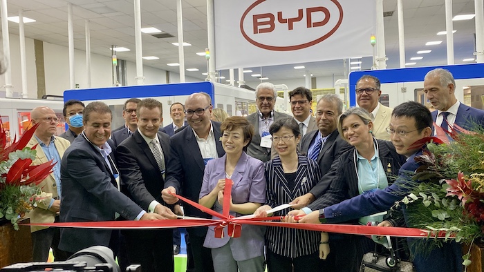 坎市前市长乔纳斯、联邦议员塞尔苏、坎市市长达里奥、BYD副总裁李柯、总领事陈佩洁、科技部代表亚历山德罗、BYD巴西CEO李铁等嘉宾共同揭幕