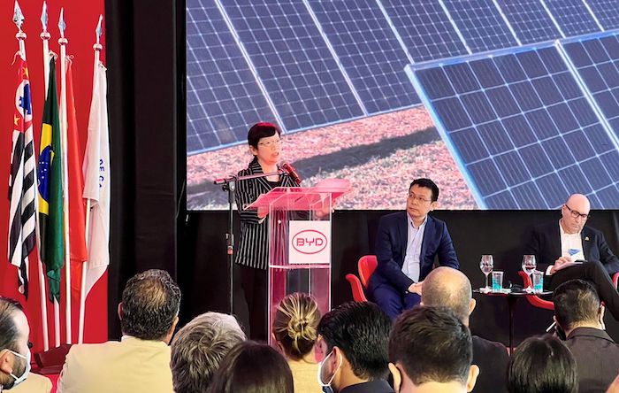 副总裁李柯在活动上简要介绍了比亚迪的情况,据介绍,比亚迪是全球最大的太阳能生产商之一,其在巴西涉及三大新能源业务领域,太阳能光伏、新能源车(纯电动/混合动力)、储能。她表示,公司加大绿色能源的投资,对改善巴西能源结构、促进清洁能源发展具有重要意义。她强调,与巴西的绿色转型和清洁能源合作潜力巨大,这也将助力本地经济社会的发展。