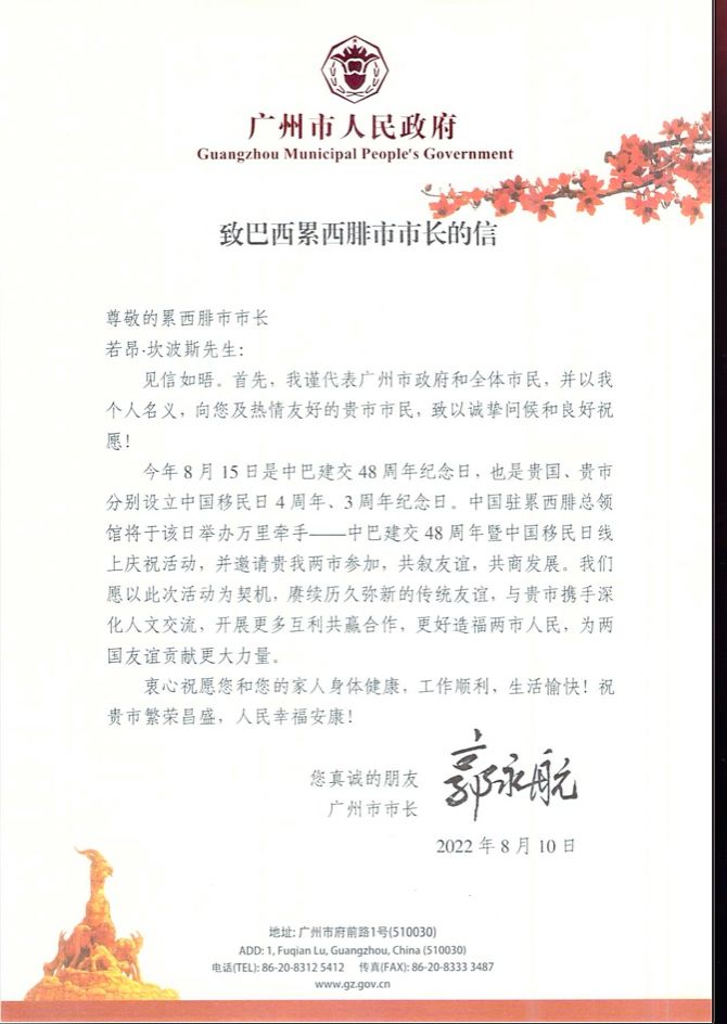 广州外事办詹德村主任表示,中国移民日的设立是纪念一代代旅巴华侨华人通过勤劳智慧在当地扎根生活并为当地经济社会发展,以及中巴两地友好交往作出重要贡献。多年来,两国在金砖机制框架下加强团结合作,合力应对挑战,共谋繁荣发展。近年来,我市与累西腓等巴西友城关系密切,开展富有成效的交流活动,涉及城市高层往来、抗疫合作、青少年交流、中医药交流、体育交流、文化交流、国际商务仲裁交流等多个领域,倡导同舟共济、团结合作,与友城共同推动构建人类命运共同体。在全球携手抗击疫情、推动经济复苏的重要时刻,广州愿与累市进一步加强在各领域务实交往合作,实现更高层次的共同发展与繁荣,造福两地市民,为中巴两国关系行稳致远添砖加瓦。
