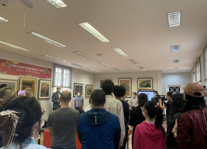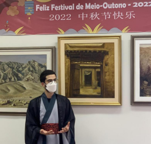 才艺表演、文化讲座、文化展台、品尝月饼......线下活动在孔院中外方院长的致辞和祝福中拉开序幕,巴方院长保利诺教授(Luís Antonio Paulino)在致辞中强调孔子学院在聚焦中巴人文交流、促进民心相通方面发挥着重要作用;暂时无法飞抵巴西的中方院长叶丹则通过录制视频的方式用“但愿人长久,千里共婵娟”表达对巴西师生的挂念和祝福。巴西本土教师李萌(Carlos Ribeiro Caldas Neto)介绍了中秋节的起源、风俗,分享对《水调歌头·明月几时有》的理解,并带来诗词吟唱穿插长笛吹奏的《九月九日忆山东兄弟》;公派教师何丹用葡语向大家讲解中国的茶文化;汉语初级班学员身着汉服完整演唱歌曲《无羁》,大家在丰富有趣的体验中了解中秋民俗,感受中秋之乐。
