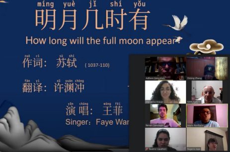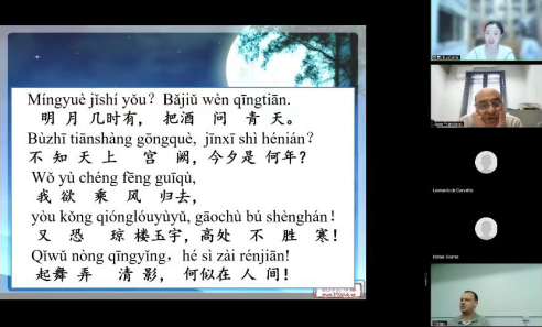 学员们还以书画“中秋”并录制诗词解说视频的形式,表达自己对中秋的感悟,送上中秋祝福。即将到湖北大学留学的学生梁柠尧Otavio Nathan Barreto de Lima用《阳关曲•中秋月》,表达了对在中国体验中秋的期待,也抒发了不久后离开家人和朋友的感慨;学生布鲁娜Bruna Giovana表示,《水调歌头·明月几时有》通过月亮的阴晴圆缺很好地表现了人世间的悲欢离合,意境深远。