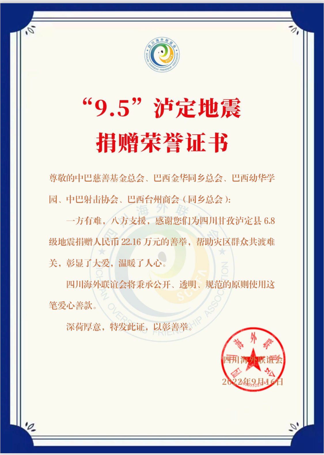 海外侨胞再次用行动证明我们的爱国之情,祝愿灾区人民早日走出地震的阴影,并向战斗在一线的抗震救灾战士致敬!向所有奉献爱心的华人华侨社团、华文学校以及每一位同胞致以最诚挚的谢意