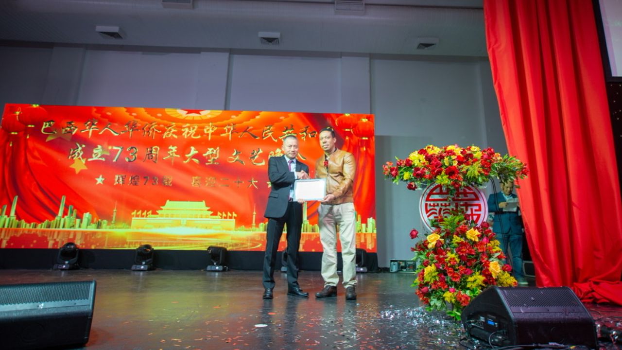 市议员埃迪尔的代表致辞时送上了市议员的祝福。并表示圣保罗不能缺少中国人,他们勤奋会做生意为圣保罗的经济发展做出巨大贡献。他说,我们很感谢在圣保罗的中国人。愿中巴友谊长存,巴西万岁,中国万岁,祝大家国庆节快乐。并在现场向华人协会会长叶周永颁发象征中巴友谊的牌匾,以示友好表达两国友谊长存。
