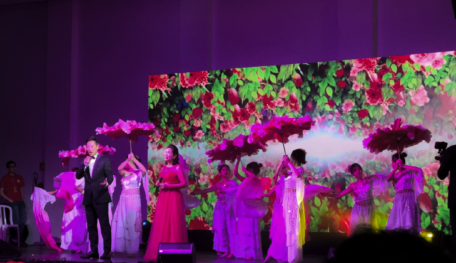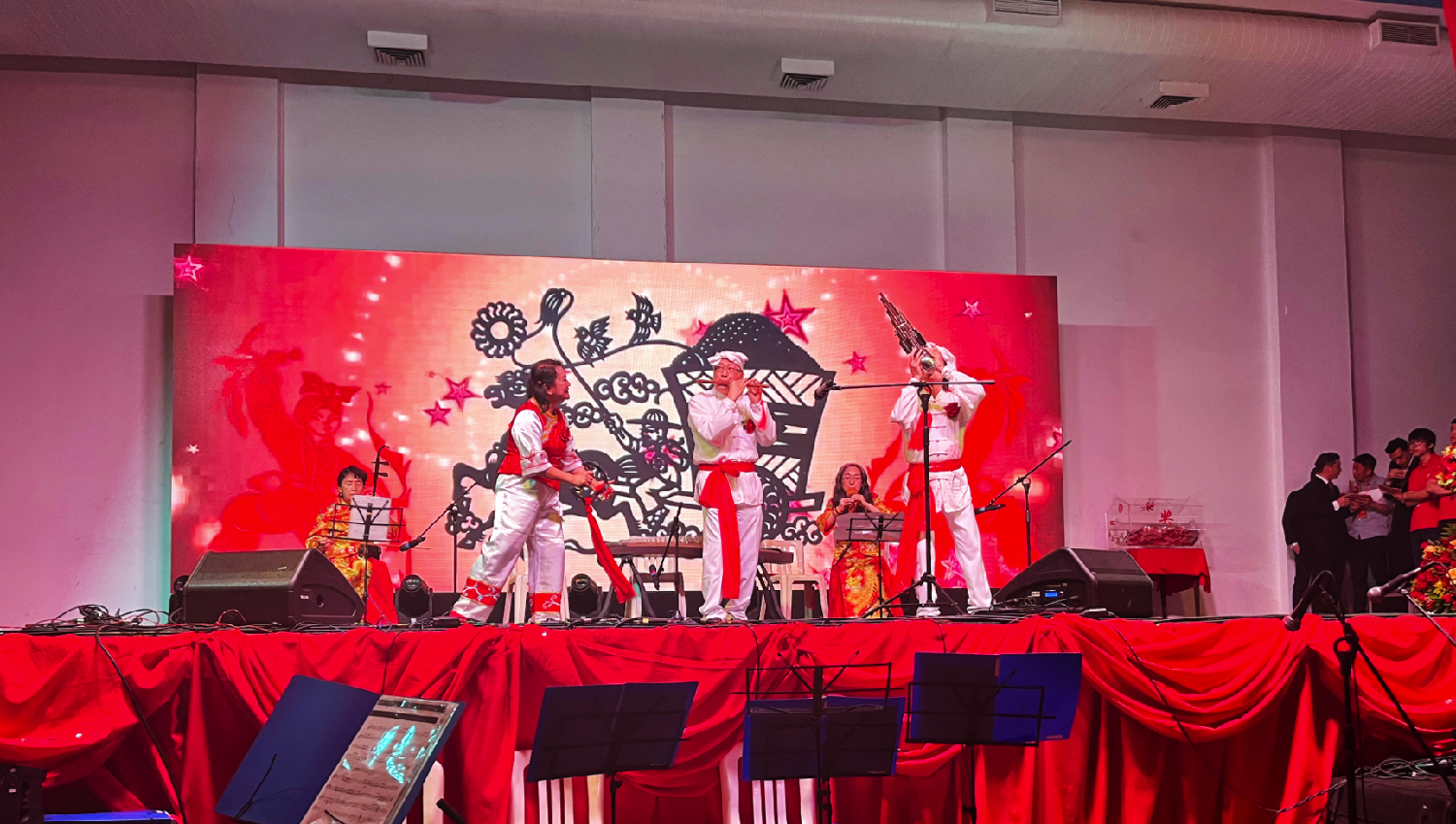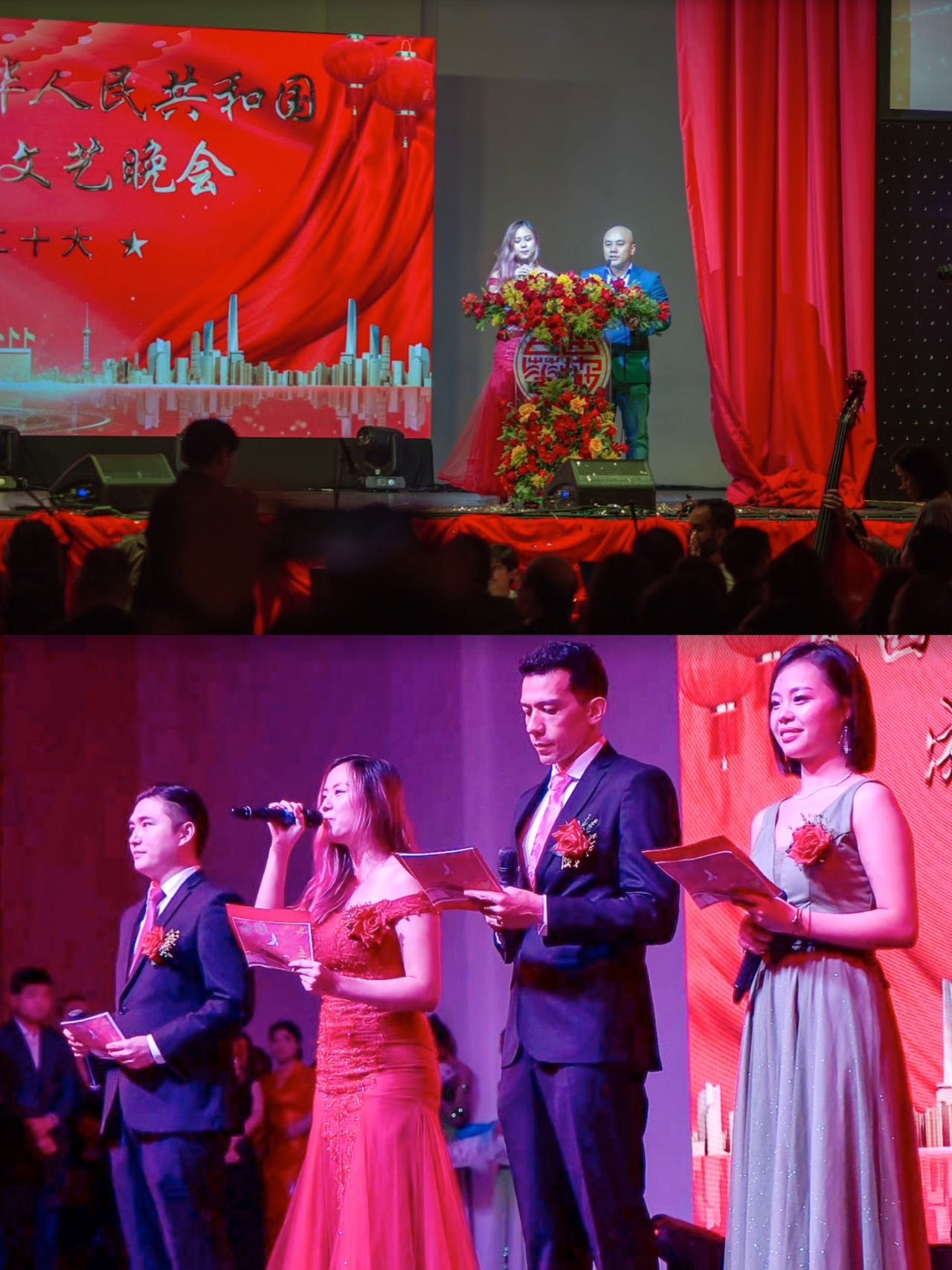 晚会开场由巴西华人协会秘书长蒋幼扬和华星艺术团的诸思瑶担任主持人。致辞结束后,四位华星主持人:温鸿翔、张迦国、诸思瑶、周灵微搭档主持文艺晚会。
